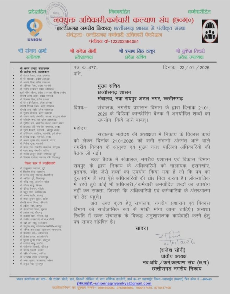 विडियो कांफ्रेंस के दौरान अधिकारी ने कहा नालायक और हरामखोर :- संघ ने मुख्य सचिव से की संचालक की शिकायत रायपुर / छत्तीसगढ़ में लगातार अधिकारियों की मनमानी बढ़ चुकी है, अमर्यादित भाषाएं परोसे जा रहे है, अधिकारी निचले स्तर के कर्मचारियों को चना मुर्रा समझ बैठते है और